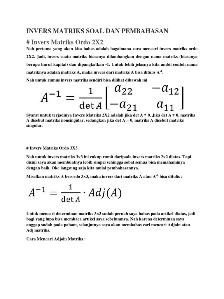 Contoh Soal Matriks Invers Dan Pembahasan Mathematics