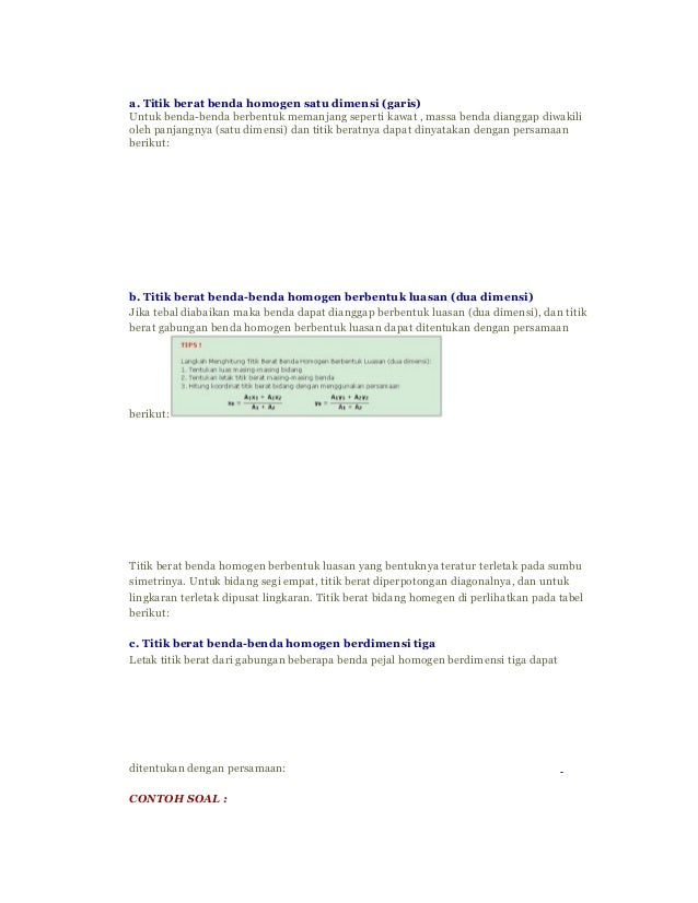 Contoh soal dan pembahasan. Pada kesempatan sebelumnya kita telah membahas bagaimana cara menentukan koordinat titik berat untuk benda satu dimensi berupa kurva homogen dan benda dua dimensi berupa bidang luasan. Titik berat benda homogen.