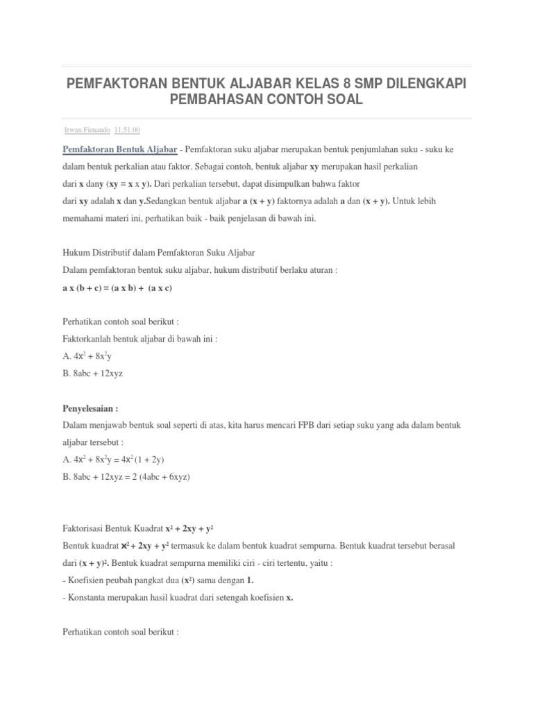 Pemfaktoran Bentuk Aljabar Kelas 8 Smp Dilengkapi
