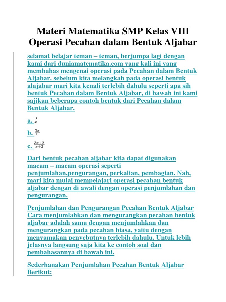 Materi Matematika Smp Kelas Viii Operasi Pecahan Dalam