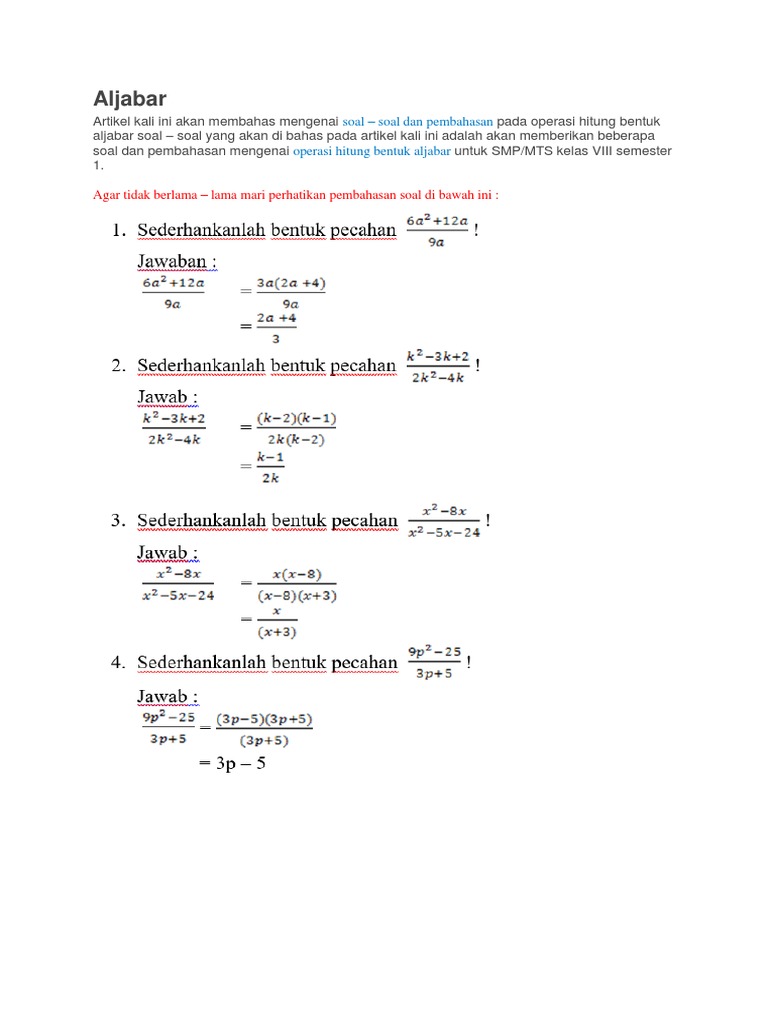 Contoh Soal Aljabar Smp Dan Penyelesaiannya Docx