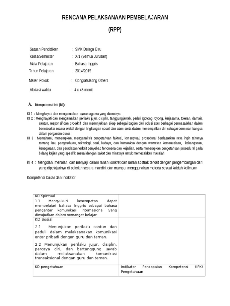 Rpp Bahasa Inggris Smk Kelas X Congratulation