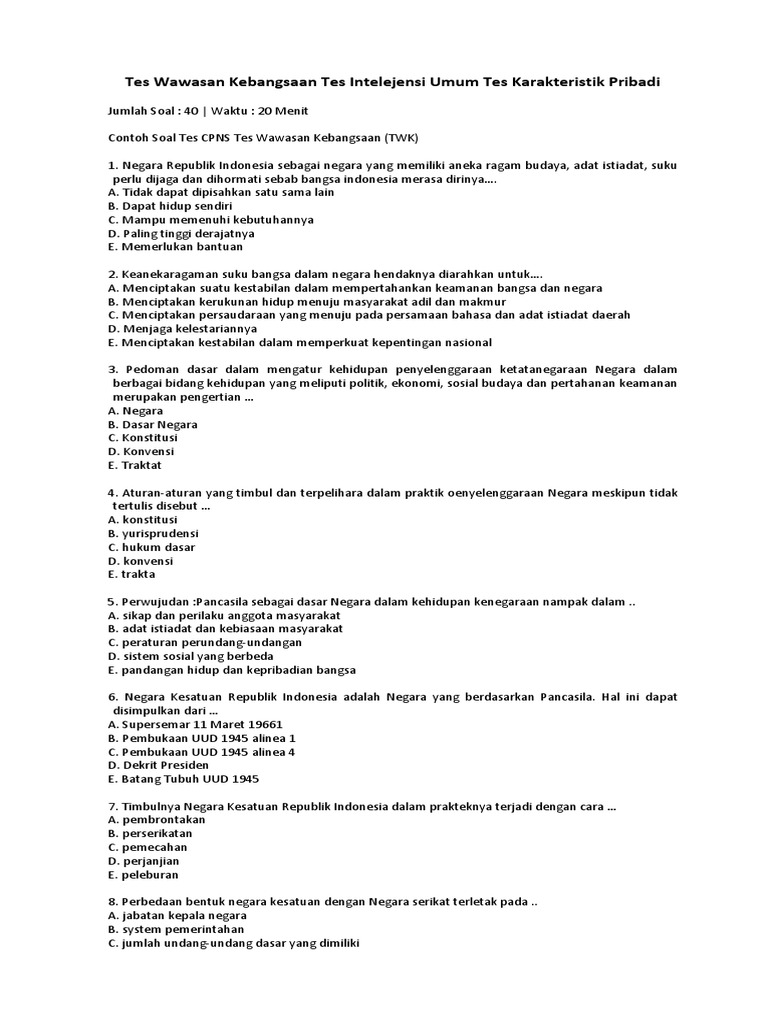 Pdf Contoh Soal Twk Cpns Tes Wawasan Kebangsaan Twk