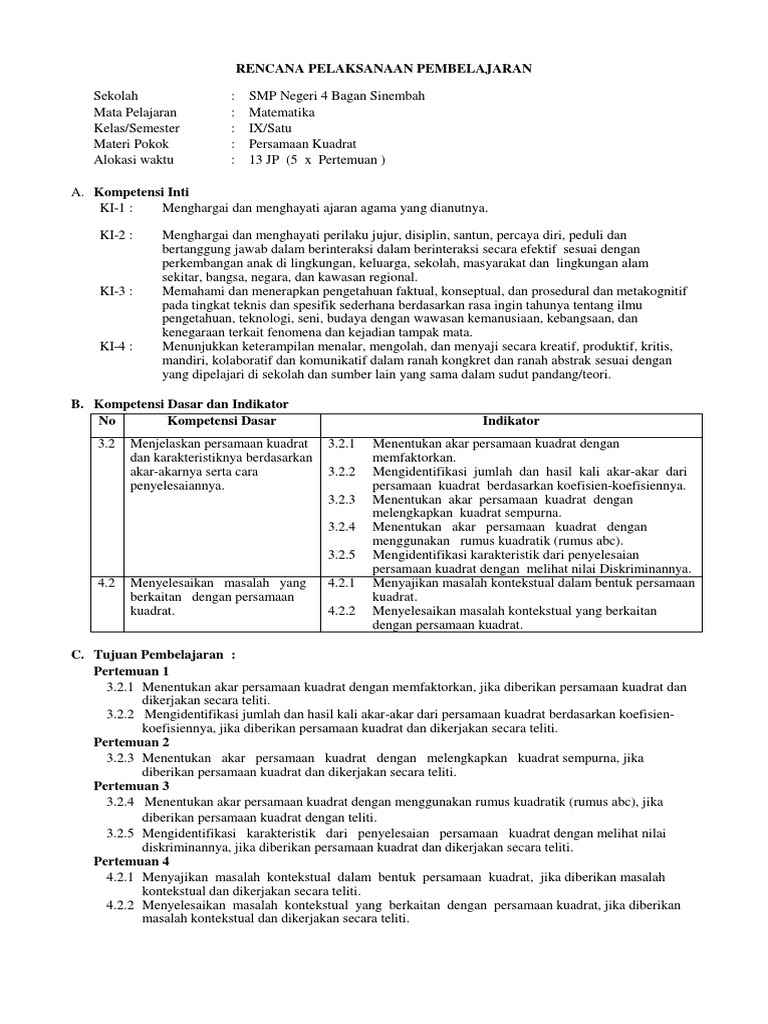 Rpp Dan Lks Materi Persamaan Kuadrat