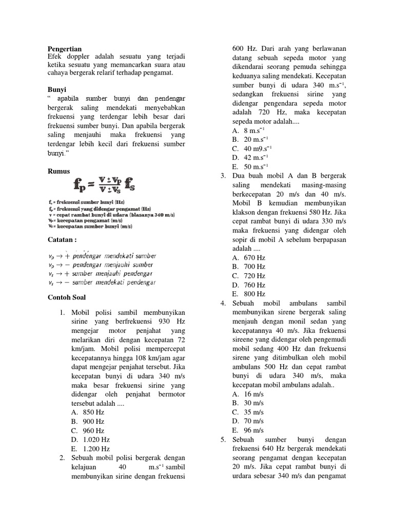 Efek Doppler - Pengertian, Rumus, Macam dan Contoh Soal from theinsidemag.com Contoh soal, dan try out dan dilengkapi berbagai fitur seperti search, jump to dan back. Contoh soal efek doppler dan pembahasan. Sekarang mari kita selesaikan permasalahan pada soal di atas. F' = frekuensi bunyi yang didengar pendengar (1/s = hz) f = frekuensi bunyi yang dipancarkan sumber (1/s = hz) v = laju bunyi (m/s) vp.