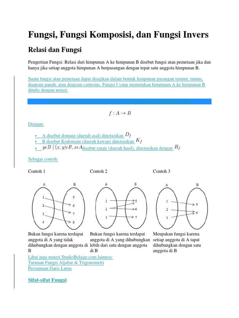 Cara menghitung nilai suatu fungsi komposisi dan fungsi invers fungsi komposisibentuk fungsi komposisi:(g o f)(x) = g(f(x))fungsi komposisi g o f adalah fungsi ko.
