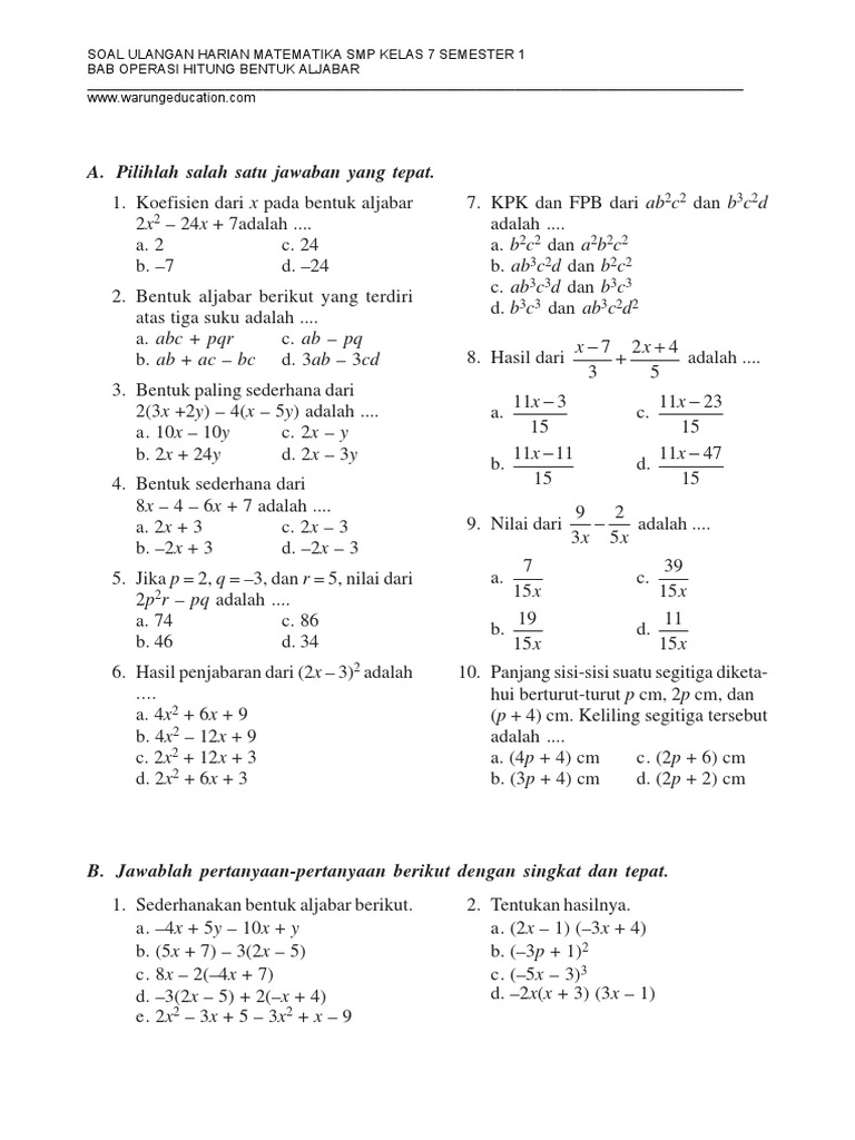 Sederhanakan Pembagian Pecahan Bentuk Aljabar Berikut A 2m 3 4b X 2 7 X 10 4 Brainly Co Id from id-static.z-dn.net Aljabar kelas 7, faktor aljabar, perkalian aljabar, pembagian aljabar, penjumlahan aljabar, pengurangan aljabar. Görünümler 256 b2 yıl önce. 2 y penyelesaian 3 xy 3 x 2y 2 prev 1 2 3 4 5 ( faktor sekutu y) 6 7 8 next materi c) pembagian pecahan bentuk aljabar pembagian merupakan invers (operasi kebalikan) dari operasi perkalian. Cara mudah mengerjakan pembagian aljabar kelas 7 aljabarkelas7. Soal aljabar ini terdiri dari 25 butir soal pilihan ganda.