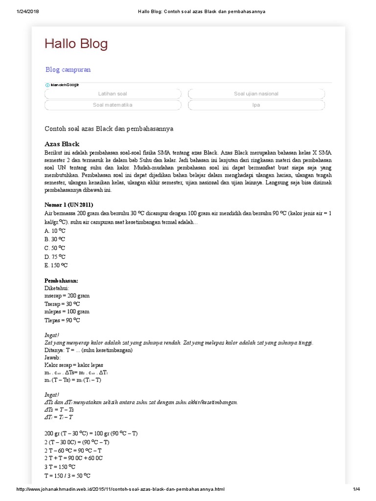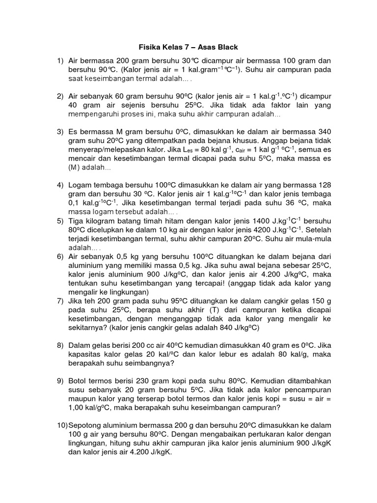 Contoh soal asas Black - Gurumuda.Net from gurumuda.net Asas black merupakan sebuah dasar teori dalam menentukkan nilai suhu campuran atau suhu gabungan antara dua buah zat atau lebih yang berada dalam kesetimbangan suhu karena proses melepaskan dan penerimaan kalor. Jika kamu ingin lebih jelas memahami kalimat yang satu ini, silahkan lihat penjelasannya secara lengkap dibawah ini! Contoh soal cpns yang kami sajikan disini tidak hanya contoh soal dan kunci jawabannya saja, namun lengkap dengan pembahasannya. Ada sebuah gelas yang berisi air yang dingin dengan massa 200 gram pada suhu 20 c dicampurkan dengan air yang panas yang.