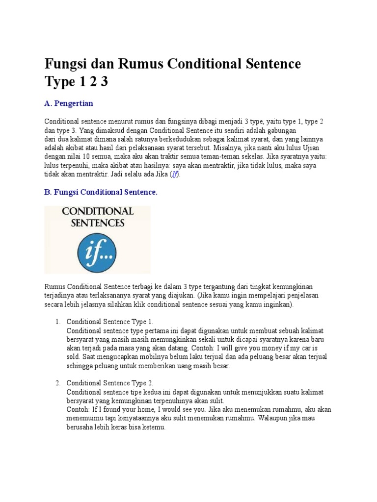 If conditional tipe 1 yang juga disebut future conditional sentence adalah sebuah kalimat pengandaian yang belum terjadi dan kemungkinan besar akan 15 contoh soal pilihan ganda present continuous tense. Ketiga type kalimat pengandaian tersebut memiliki pemakaian yang berbeda. Conditional sentences are also known as conditional clauses or if clauses. Contoh soal conditional sentence type 1. Menunjukan sebuah kondisi di masa sekarang atau masa yang akan datang, dan sekaligus menunjukan suatu kemungkinan yang sangat mungkin terjadi yang disebabkan oleh klausa if. Berikut ini adalah contoh conditional sentences dalam bahasa inggris: