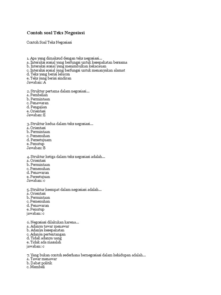 Soal Dan Jawaban Tentang Teks Negosiasi - Kumpulan Contoh ... from imgv2-2-f.scribdassets.com Contoh soal uas/pas semester ganjil bahasa indonesia kelas 9 kurikulum 2013 terbaru teks pidato persuasif. Karena pendidikan perlu adanya evaluasi maka hal. Pernyataan berikut benar, kecuali ….