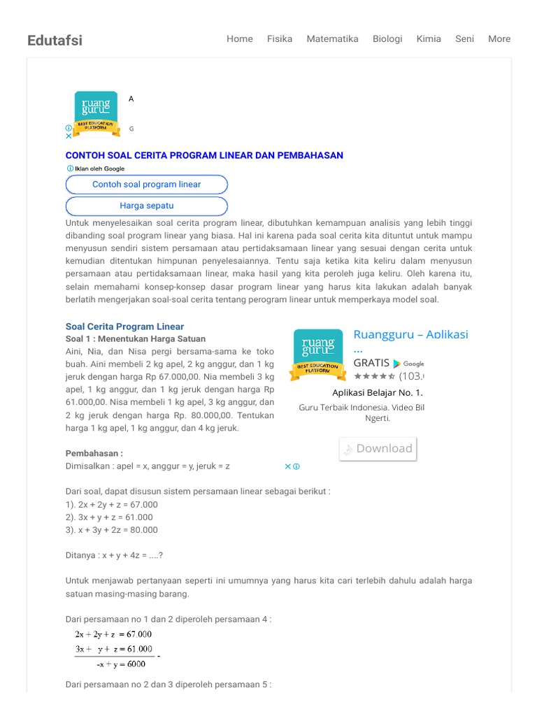 20+ contoh soal program linear dan kunci jawaban beserta pembahasannya sebanyak 20 butir yang kami rangkum untuk siswa pelajari persiapan. Pernahkah anda mendengar kata program linear? Aini membeli 2 kg apel, 2 kg anggur, dan 1 kg jeruk dengan harga rp 67.000,00. Tingkat soal program linear yang diberikan di sini sesuai level kognitif aplikasi. Masalah yang ada di dalam program linear pada umumnya berhubungan dengan memaksimalkan untung atau meminimalkan biaya produksi. Kumpulan soal cerita program linear 1.