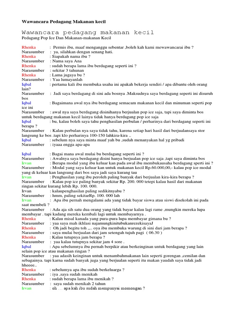 Pertanyaan Wawancara Pedagang Revisi Sekolah from imgv2-1-f.scribdassets.com Contoh wawancara singkat dengan berbagai narasumber yang baik beserta jawabannya dapat kalian baca di web dosensosiologi.com. Jumlah pertanyaan hendaknya disesuaikan dengan situasi dan waktu. Contoh jawaban pertanyaan wawancara kerja ini: Mudah beradaptasi dengan cepat saya seorang yang bisa beradaptasi dengan cepat di lingkungan baru, sebagai contoh saya sering mengikuti berbagai organisasi yang bisa mendorong saya menjadi. Lalu membuat jawaban yang sesuai dengan pengalaman.