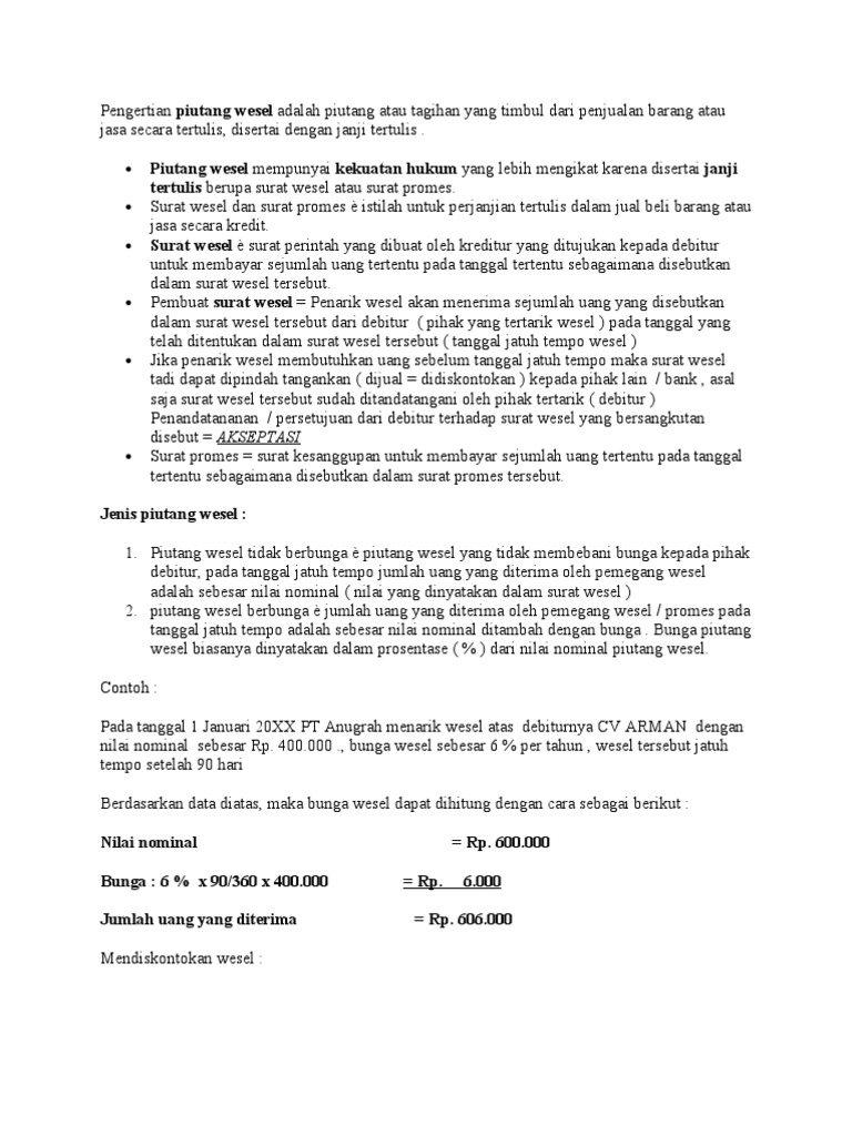 Source: i0.wp.com Contoh soal piutang wesel tidak berbunga. Seperti contoh diatas, wesel berbunga 12 % maka perhitungannya. Wesel tidak berbunga ialah wesel yang ketika tiba jatuh tempo dibayar sesuai atau sebesar dengan nilai nominalnya. Check spelling or type a new query. Pada tanggal 10 maret 2020, pt sinar menjual barang seharga rp. Wesel adalah janji tertulis yang tidak bersyarat dari satu pihak kepada pihak lainnya untuk membayar. Perhitungan diskonto piutang wesel berbunga. Perhitungan wesel berbunga dan wesel tidak berbunga tentunya akan berkaitan dengan jumlah uang yang akan didapatkan dimasa depan bagi perusa. Berbunga ialah salah satu jenis wesel yang pada saat pembayarannya selain membayar pokok utangnya juga harus dapat membayar bunga sesuai dengan kesepakatan sebelumnya.