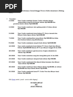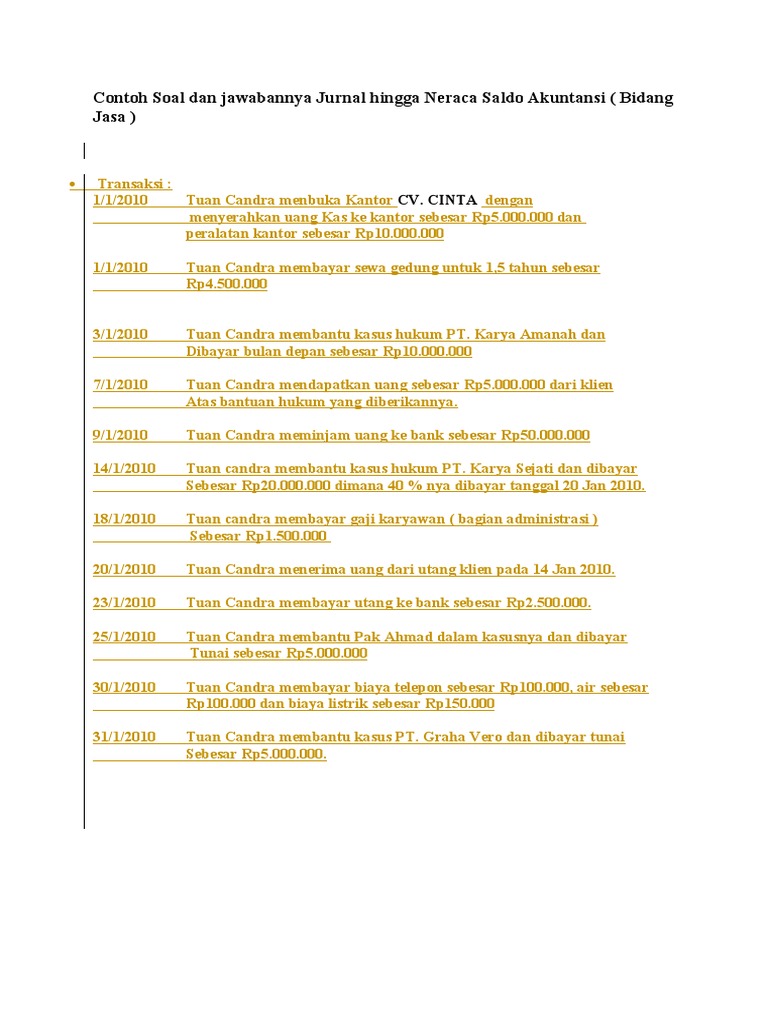 Source: imgv2-1-f.scribdassets.com Contoh soal jurnal umum akuntansi perusahaan jasa. 1/1/2010 tuan candra menbuka kantor candra advokat dengan. Neraca | pengertian dan contoh neraca. Berikut ini yang bukan fungsi hukum di indonesia adalah …. Laporan keuangan yang terdiri dari neraca. Contoh soal dan jawabannya jurnal hingga neraca saldo akuntansi ( bidang jasa ) transaksi : Buatlah neraca saldo setelah penutupan untuk data diatas? Contoh soal pilihan ganda persamaan dan pertidaksamaan nilai mutlak linear satu variabel 16126383. Banyak latihan membuat neraca saldo akan menambah pemahaman anda tentang mengerjakan soal neraca saldo khususnya perusahaan dagang dengan metode perpetual.