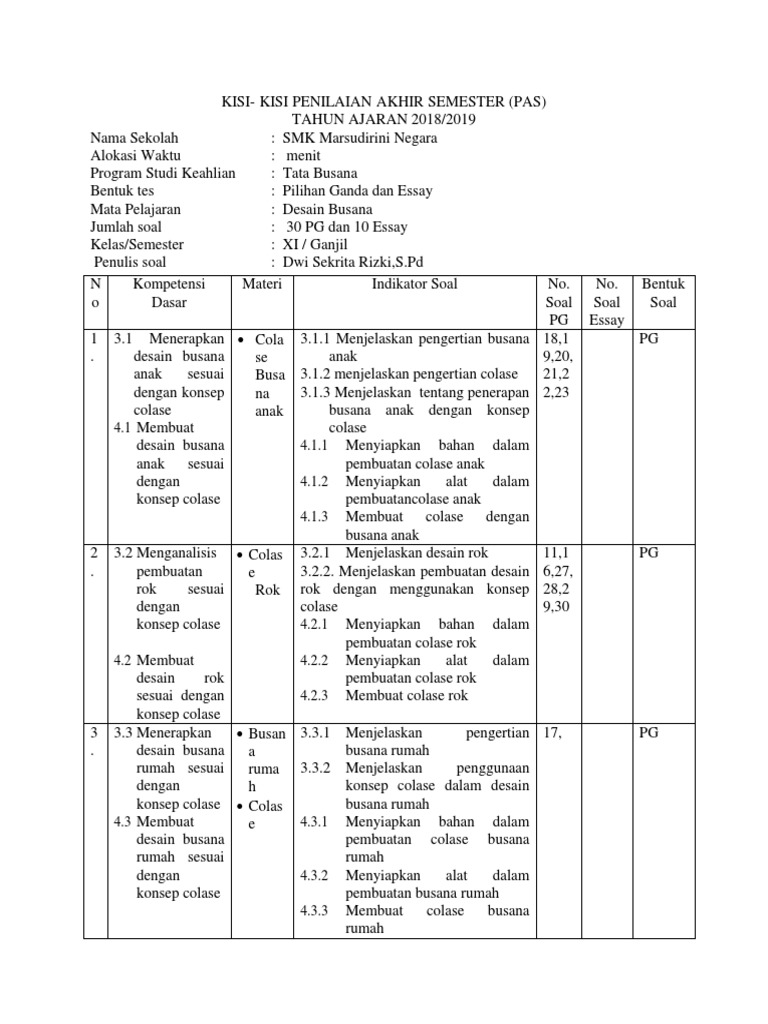 Source: smkn3pwt.sch.id Ujian akhir semester atau disingkat dengan uas sudah hampir tiba, seluruh murid smk semua jurusan pada mempersiapkan diri untuk belajar buat menghadapi ujian sekolah pada akhir. Makalah materi soal penjaskes kelas 11 diterangkan mulai dari pengertian, jenis, fungsi, struktur, tujuan, ciri, kaidah, makna, konsep, dan contoh lengkapnya. Ujian akhir semester atau disingkat dengan uas sudah hampir tiba, seluruh murid smk semua jurusan pada mempersiapkan diri untuk belajar buat menghadapi ujian sekolah pada akhir. Desain yang digunakan untuk tujuan promosi atan menarik perhatian digunakan teknik penyajian gambar a. Desin hiasan busana merupkan desain yang dibuat untuk meninggkatkan mutu suatu benda dari desain stuktur,di dalam desain tersebut tersebut terdapat keseimbangan dari suatu hiasan yang sangat penting untuk diperhatikan.sebutkan. 20210326 soal pkn kelas 11 semester 1 beserta jawabannya kurikulum 2013 contoh soal ppkn kelas xi smt 1 k13 kurtilas pilihan ganda atau disingkat pg untuk soal. Clatihan soal dan jawaban tata busana bali teacher download buku kimia kelas xi sma/ma kumpulan contoh essay untuk ppkb ui kolase desain otomatisasi kelola kepegawaian (c3). 3.4 menerapkan desain busana rumah sesuai dengan konsep kolase. Keharmonisan dalam pemilihan atau perpaduan berikut ini adalah rpp dasar desain busana kurikulum 2013 yang bisa anda unduh secara gratis dengan menekan tombol download yang ada.