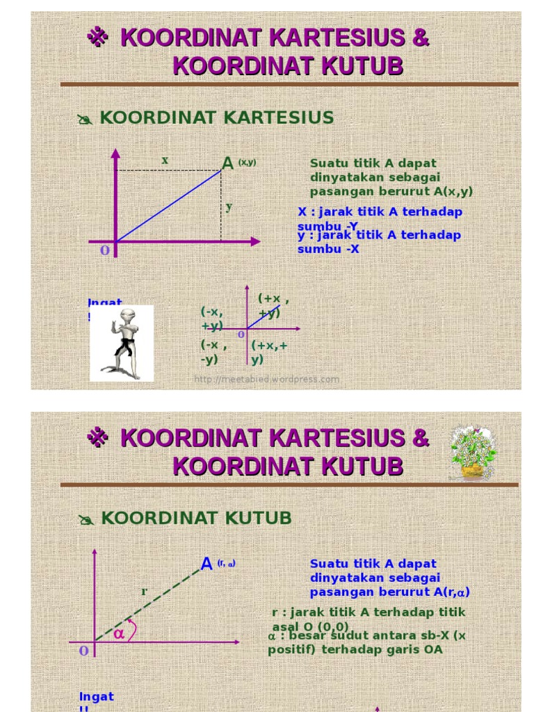 Source: image.slidesharecdn.com Koordinat kartesius & koordinat kutubjika diketahui koordinat kutub ( r , ) :maka : Matematika koordinat kartesius kutub contoh soal dan penyelesaiannya barisan sistem sd kelas 6 sifat bunyi cahaya kumpulan rumus. Sebuah sistem koordinat kartesius (uk /kɑːˈtiːzjən/, us /kɑːrˈtiʒən/) adalah sistem koordinat yang menetapkan setiap titik secara unik dalam bidang dengan serangkaian koordinat numerik, yang merupakan jarak yang bertanda titik dari dua garis berorientasi tegak lurus tetap. Untuk mengkonversi koordinat kartesius menjadi koordinat kutub. 3cos 1 2 2 600 y 37. Hubungan antara koordinat kartesius p(x,y) dengan koordinat kutub p(r, α) sin α= y/r ↔ y=r.sin α cos α= x/r ↔ x=r.cos α tan α= y/x ↔ α=arc.tan α konversi koordinat kutub menjadi koordinat katesius dan contoh soal: Contoh 2 contoh soal beserta pembahasan materi relasi dan fungsi. Sehingga koordinat kutub yang dimaksud adalah p( 5√2, 315º). Contoh 3 t pada limas a cm segiempat beraturan d c t.abcd yang semuaa a cm b rusuknya sama panjang,sudut antara ta dan bidang abcdadalah….