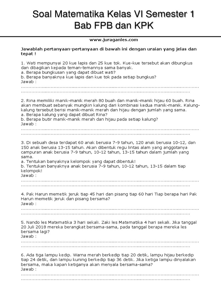 Soal Kpk Dan Fpb Kelas 4 Juragan Les. Dan di bawah ini adalah contoh soal fpb dan kpk. Hal ini menyesuaikan dengan jumlah soal yang cukup banyak untuk melatih kemampuan kita dalam memahami kpk dan fpb. Soal ini semacam kuis atau tes online matematika yang mana kalian bisa langsung menjawab soal dengan cara mengklik bulatan di depan tes online fpb dan kpk petunjuk: Soal sudah dilengkapi dengan kunci jawaban dan pembahasan. Soal ini terdiri dari 20 soal pilihan ganda dan 15 soal isian dan 5 soal urain. Berikut ini adalah soal cerita fpb dan kpk kelas 6. Tidak lupa, kami juga sudah melampirkan kunci. Demikianlah soal ulangan harian kpk dan fpb kelas 4 yang disertai pembahasannya kurikulum 2013. Soal kpk dan fpb yang kami bagikan ini sangat sesuai dengan materi mtk yang dipelajari di mulai dari kelas 4, 5, dan 6. Maka dengan menggunakan pohon faktor caranya sama dengan no 9 pilihan ganda. Materi kpk dan fpb dalam soal cerita. Soal diatas adalah soal tentang fpb.