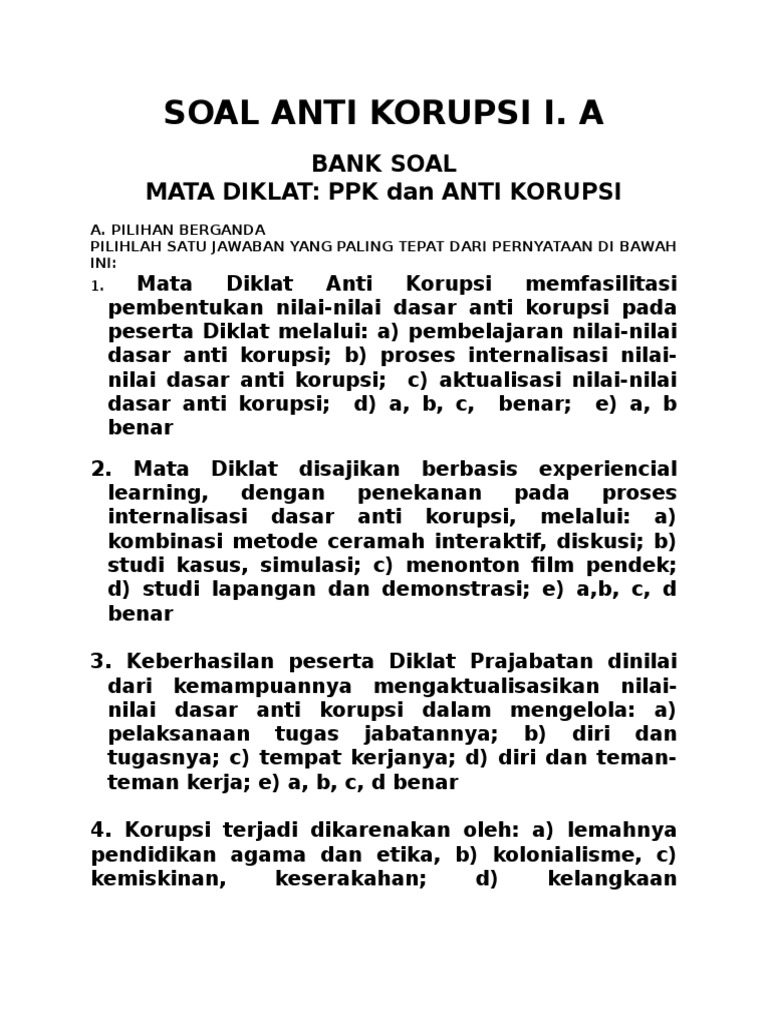 Soal Pilihan Ganda Pendidikan Anti Korupsi. 1 pentingnya implementasi pendidikan anti korupsi di lembaga pendidikan. Soal pilihan ganda bab vi ppkn. Pendidikan anti korupsi di lembaga pendidikan indonesia sangat penting dilakukan sebab indonesia sudah berada di tepi jurang akibat tradisi kolonial korupsi tersebut. Pernyataan dampak korupsi yang manamerupakan pendapat paulo maura (1995) : Korupsi bermotif ganda secara lahiriah kelihatannya hanya mendapatkan uang, tetapi. Soal latihan pbak full 105 soal dari seluruh kelompok. Budaya korupsi indonesia di tepi jurang. Negara korup harus membayar hutang lebih besar b. Serta upaya pemberatasan korupsi 1. Soal pilihan ganda tentang sistem hukum dan peradilan nasional dan jawaban. Pilihan berganda pilihlah satu jawaban yang paling tepat daripernyataan yang pokok pejabat tersebut mendapatkan uang. Dari pernyataan di bawah ini 2.