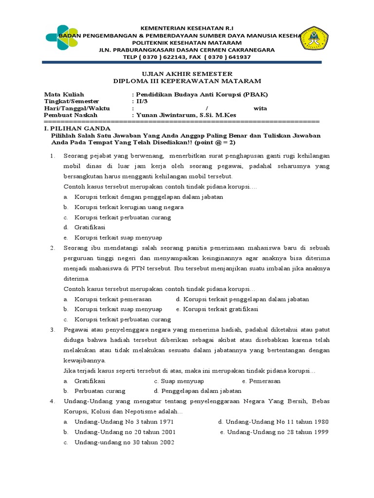 Http Bppsdmk Kemkes Go Id Pusdiksdmk Wp Content Uploads 2017 10 Juknis Pbak Cetak Pdf from Soal pilihan ganda ketimpangan sosial dan kemiskinan. Melalui pendidikan anti korupsi inilah nantinya bisa menjadi bekal bagi mahasiswa untuk bertindak jujur dalam bekerja. Korupsi (pengertian korupsi, dasar aturan pemberantas korupsi, kasus korupsi yang telah dikenakan sanksi) 11. Soal pilihan ganda tentang sistem hukum dan peradilan nasional dan jawaban. 1951) atau corruptus (webster student dictionary hal itu menyangkut pemilihan metode atau cara pemberantasan korupsi, nasution berpendapat apabila ingin berhasil seiring dengan berjalannya.