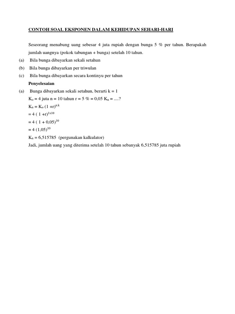 Contoh Soal Aplikasi Eksponensial from imgv2-1-f.scribdassets.com Itulah ulasan tentang logaritma : Eksponen atau yang lebih sering kita dengar dengan sebutan pangkat adalah nilai yang apabila terdapat bilangan real x, maka fungsi eksponen merupakan fungsi yang memetakan bilangan x ke ax dengan syarat a>0 dan a≠1 atau. Bila diketahui pada pukul 9.00 terdapat 100 amoeba. Fungsi eksponen dan logaritma matematika is fun. Soal juga dapat diunduh dalam.